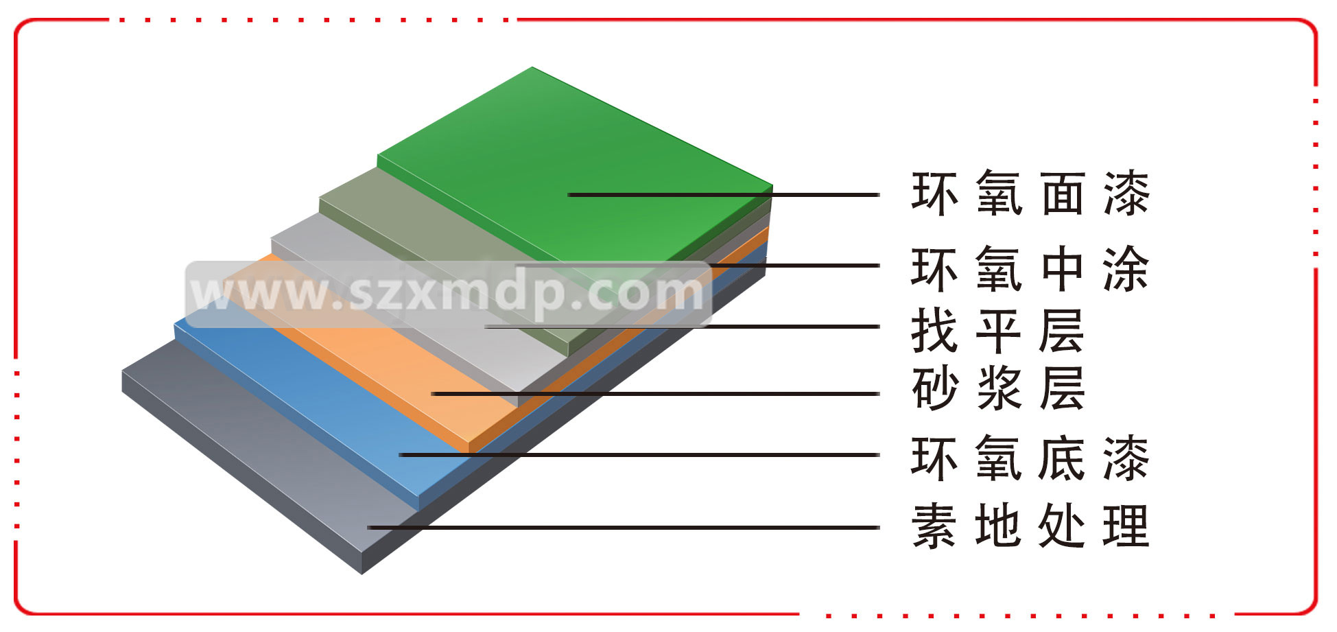 ![]() ◎ 選用無(wú)溶劑高級(jí)環(huán)氧樹(shù)脂加優(yōu)質(zhì)固化劑制成,無(wú)毒、無(wú)污染; ◎ 化學(xué)性能優(yōu)良,耐酸、堿、鹽、油類介質(zhì)腐蝕,特別耐強(qiáng)堿性能優(yōu); ◎ 平整光亮,可獲鏡面效果; ◎ 機(jī)械性能優(yōu)良,耐磨、耐壓、耐沖擊,有一定彈性; ◎ 施工快捷方便; ◎ 厚度2mm/8年,3mm/10年,4mm/12年,5mm/15年以上。 | ![]() 素地處理:打磨、吸塵處理: 底 涂:涂刷1-2遍環(huán)氧樹(shù)脂強(qiáng)滲透封閉底涂; 砂 漿 層:環(huán)氧樹(shù)脂中涂料調(diào)石英砂,用鏝刀或平刀抹刮,根據(jù)厚度要求可以多層施工; 找 平 層:再次打磨找平,進(jìn)行吸塵處理; 中 涂:批刮環(huán)氧樹(shù)脂中涂膩?zhàn)訉硬牧希?br style="box-sizing: border-box;"/>面 涂:用鏝刀將環(huán)氧樹(shù)脂自流平面漆鏝涂于中涂涂層之上 |