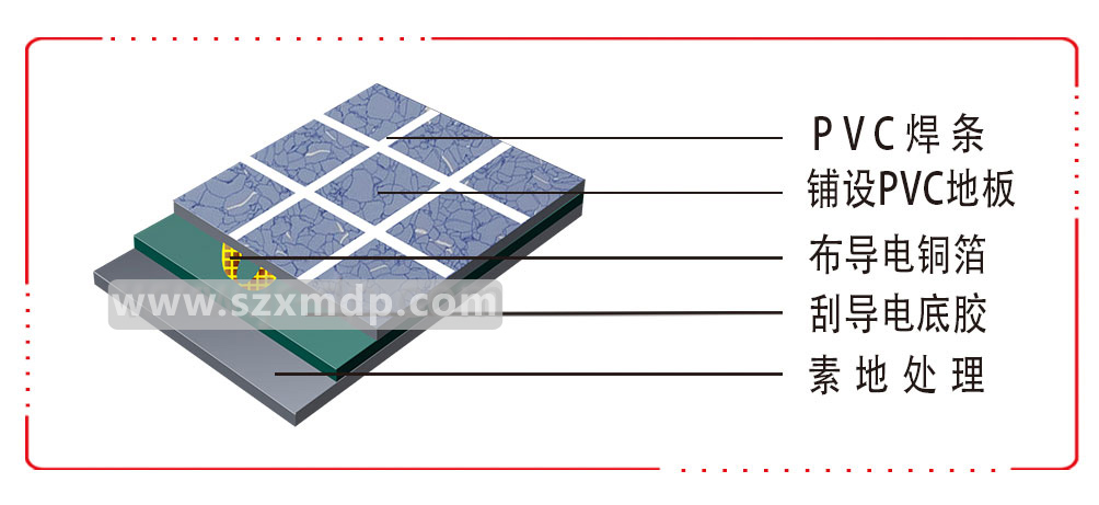 ![]() ![]() | ![]() 1、素地處理; 2、畫線:尋找中心線; 3、布導電銅箔; 4、鋪PVC靜電地板; 5、焊接:可根據(jù)要求焊接成整體無縫。 |